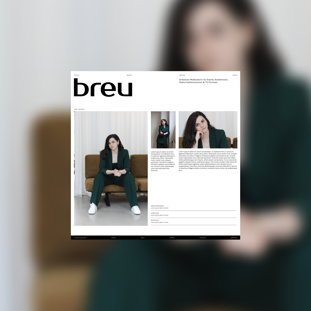 Für Breu wurde eine persönliche Website gestaltet und entwickelt, die Referenzen aus vergangenen Auftritten und das Angebotsspektrum präsentiert. Durch ein individuelles Webdesign wurde das Personal Branding gezielt gestärkt, um die Einzigartigkeit der Moderation hervorzuheben.